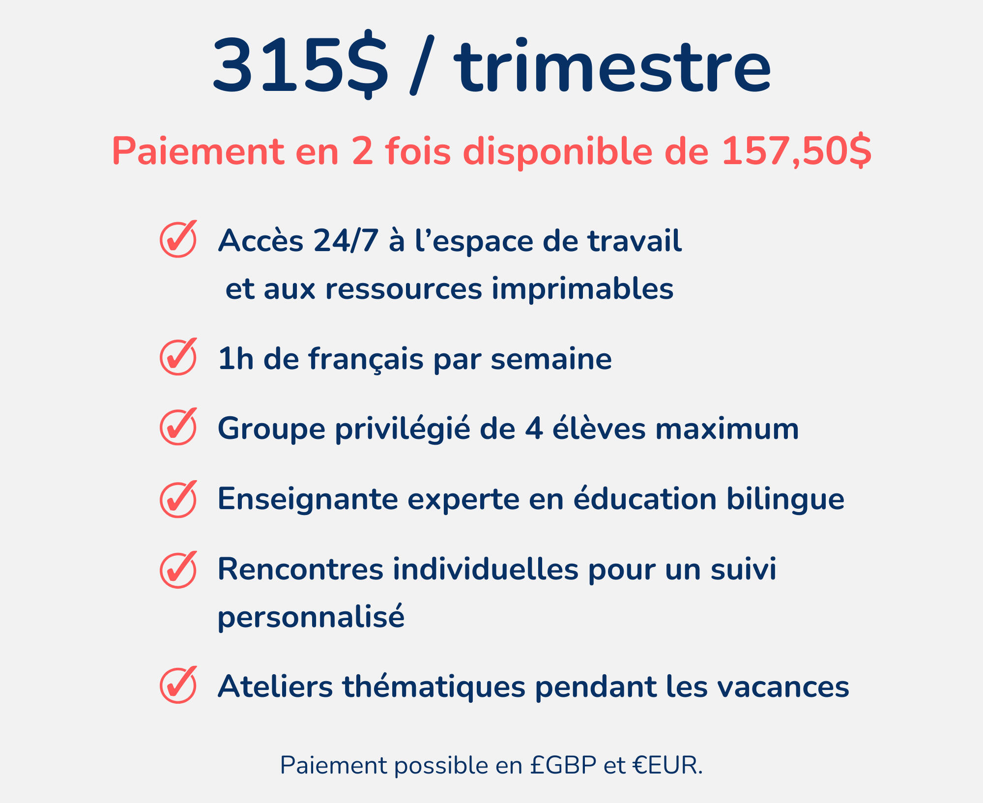 Bonjour! Je suis Noémie Maps, fondatrice de l'École des Frenchies, expatriée et enseignante dans des écoles bilingues et instituts de langue depuis 7 ans.Les enfants expatriés francophones rencontrent des défis uniques: grandir entre plusieurs cultures et jongler avec différentes langues.Ici, il nous tient à cœur de développer la maîtrise du français et de maintenir un lien fort avec notre belle culture, même loin de chez soi.Cultivons leur avenir, et ouvrons le monde des possibles!